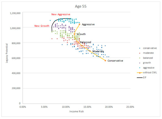 In Figure 3, the issue age is fixed at 55. We first remark that because we wish to maximize legacy potential and minimize income risk, the optimal, or most efficient, portfolios are those in the “northwest” section of the graph. For portfolios that include only a mutual fund, there are only four portfolios corresponding to the four postretirement asset allocation strategies: Moderate, balanced, growth, and aggressive. We connect these four portfolios with the orange curve. We color-code other portfolios according to the postretirement investment strategy: For example, the purple dots represent portfolios which include a LIRP and in which the mutual fund is a growth fund. Each purple dot represents a different face amount or withdrawal strategy. The black curve is the EIF; in other words, it connects some of the most efficient portfolios.