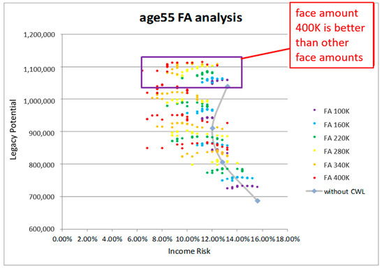 In Figure 4, again, we consider a 55 year old. We color-code the dots on the graph according to the face amount of the life insurance. For example, all of the red dots correspond to portfolios with a $400K life insurance policy but with one of the 16 different income withdrawal patterns and one of the four different postretirement asset allocation strategies within the mutual fund. We see that the highest face amounts occupy the northwest corner of graph; thus, we conclude that higher face amounts produce more efficient portfolios than lower face amounts.