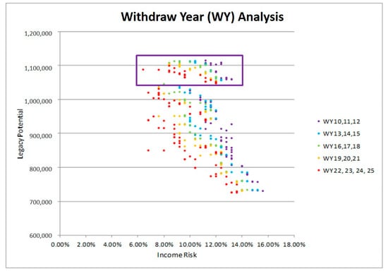 In Figure 5, the issue age is again fixed at 55. This time, we color-code the portfolios according to the number of withdrawals from the life insurance product. Thus, the red dots correspond to portfolios with 22–25 annual withdrawals from the life insurance but with different face amounts for the life insurance and asset allocations within the mutual fund. We see that for a fixed value of the legacy potential, the longest withdrawal patterns (red dots) produce the lowest income risk.