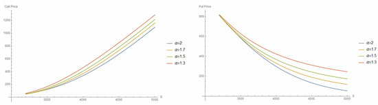 Call (left graph) and put (right graph) option prices, as a function of S and for various stability parameters (parameters: , and ). In both the call and put cases, the prices become higher as decreases.