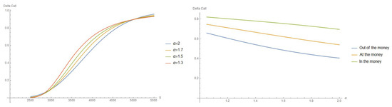 (Left graph): Plot of the call’s Delta, in function of the market price S and for different stability parameters . (Right graph): Plot of the call’s Delta, in function of the stability parameter and for different market configurations. In both cases, , and .