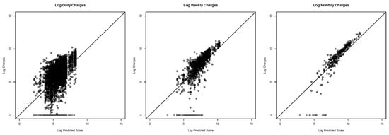 Log daily, weekly, and monthly charges (predicted versus actual out-of-sample charges).