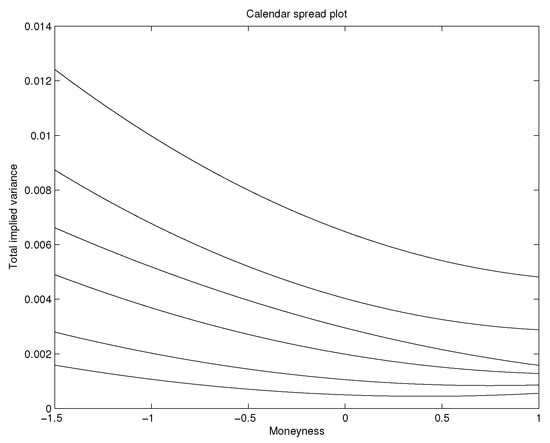 Numerical implementation of the quadratic approach is done over six different times to maturity for S&P 500 call option data traded on December 15, 2014. Table 1 represents the optimal values of for each of the six different times to maturity. Figure 1 illustrates the plots of total implied variance for all six volatility slices and it shows that total implied variance is an increasing function of time to expiration since the volatility slices never cross each other, so the calibration method eliminates calendar spread arbitrage. Plots for all six Durrleman’s functions are shown separately for each volatility slice in Figure 2. The plots of Durrleman’s function for all six times to maturity are strictly positive around at-the-money, implying the absence of butterfly arbitrage for each volatility slice. Therefore, due to the conditions of Definition 2, we parameterized total implied variance for S&P 500 call option data in such a way that there is no static arbitrage.