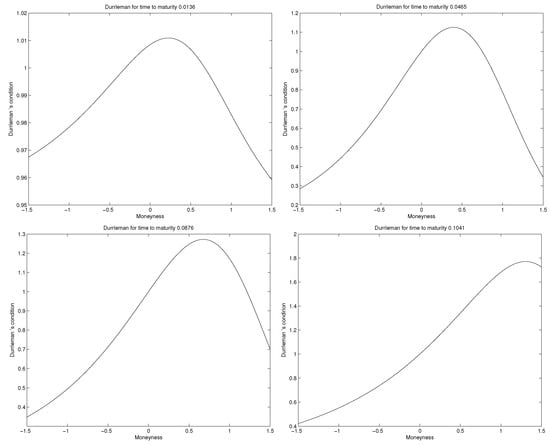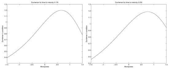First of all, we show that the minimum value of the proposed model belongs to the interval since we assumed options with less than one year expiry time which makes bounded between 0 and 1. So, the inequality and equivalently the inequality must be held. It is easily satisfied because of conditions 2 and also the initial conditions of Section 3.1. Moreover, another intuition behind the condition is to guarantee the model to be less than one in case of ATM. Now, we do some rearrangement to make the Durrleman’s function take positive values everywhere.