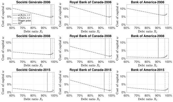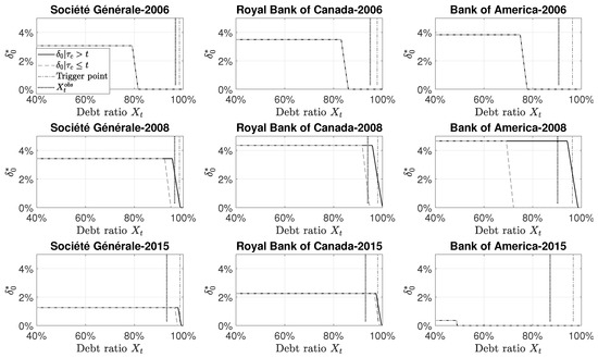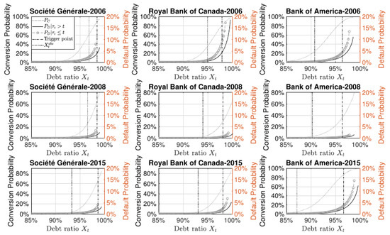 The conversion probability is calibrated such that there is a conversion probability over the observed mean debt ratio and a conversion probability at the trigger level imposed by the regulator. We are in the presence of two equations with two unknown parameters: and . The observed mean debt ratio, denoted by corresponds to the average debt ratio from 2004 to 2017. The trigger level used, denoted by , is the average trigger level imposed by the regulator from 2004 to 2017. Solving the system of equation, we have