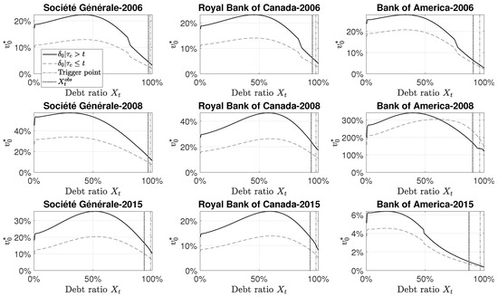 where , . Indeed, represents the critical debt ratio from which the increasing behaviour of the default probability (seen as a function of the debt ratio) accelerates. Because the CoCo instrument provides the standard debt holders with an additional protection against default risk, the critical debt ratio is slightly higher whenever the CoCo debt is present in the debt structure. Consequently, the conditional default probabilities are