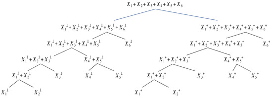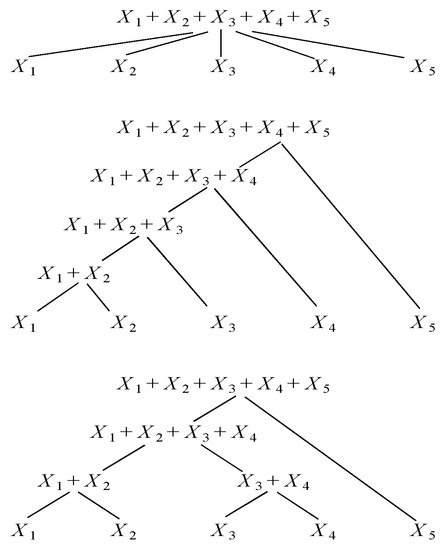If unique description of the joint distribution of individual risks is not crucial and the focus is solely on obtaining an easily interpretable model for the total risk, the individual risks can be aggregated in a hierarchical way. Such process involves specification of partial dependencies between the groups of risks in different aggregation steps (Arbenz et al. 2012). For pairwise accumulation, we first select the two risks and construct a copula model for that pair. Then, we replace and by their sum and treat it as a new, combined risk. A simple example is given in the middle panel of Figure 1 depicting the sequential risk aggregation scheme in Côté and Genest (2015). With bivariate (1) inducing the convex sum approximation (7) at the branching nodes we have: