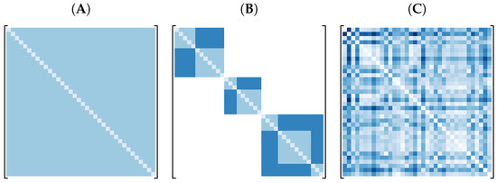 Illustration of hypothetical correlation matrices: (A) exchangeable, (B) nested block diagonal, and (C) unstructured correlation matrix.