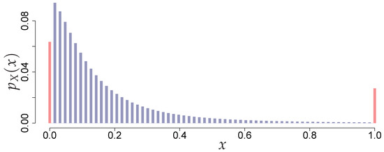 where and are atoms at zero and one damage ratio, respectively, and is the (discretized) pdf describing the main part of the mixture, see Figure 3 for an example and Section 3 for parameterization used in this study. The atoms are a common feature inferred from analysis of CAT insurance claims data. They also emerge during gross loss portfolio roll-up as a result of applying stop-loss insurance and/or re-insurance terms—deductibles and limits assembled into a variety of tiers/structures.