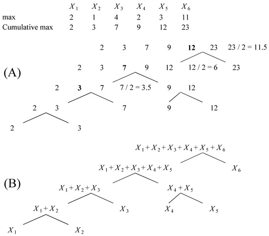 An example of RNN approach for determining topology of hierarchical risk aggregation tree for six risks with zero minima. The maxima and cumulative maxima characterizing losses for the six risks are presented in the upper panel. (A) The algorithm takes the largest cumulative max and halves it to obtain the number c. Then, it binary searches for the number closest to c except for the last element in the sequence. This number (showed in bold) becomes the cumulative maximum of the new subsequence. The search is repeated until the subsequence consists of two elements. (B) The resulting hierarchical aggregation tree.