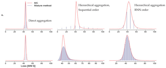 The runs above were compared with Monte Carlo (MC) simulations. We applied Latin Hypercube Sampling in McKay et al. (1979) with sample reordering in Arbenz et al. (2012) to impose correlations between samples. We generated 30 realizations with 1 MM samples each. Second order statistics and Tail Value at Risk (or p%-TVaR, which measures the expectation of all the losses that are greater than the loss at a specified p% probability, see, e.g., Artzner et al. 1999; Latchman 2010) for these runs are presented in Table 1. For the direct model, linear regriding inflates the variance of the total risk. This behavior is alleviated by tail truncation and/or 4-point regriding coupled with RNN order of convolutions. Variance of the total risk obtained from the sequential model with linear regriding and no truncation is higher than the corresponding variance of the RNN model. This is due to increasing size of the partial aggregate pdf support at upper branching nodes of the sequential tree as compared to that of the individual risks being cointegrated to these nodes. Again, tail truncation and 4-point regriding tackles this effect. For the RNN model, the reproduction of the tail statistics is poor if linear regriding is applied with or without tail truncation. These errors are reduced by 4-point method in Algorithms 4 and 5. Figure 6 shows comparisons between the aggregate distributions for direct and hierarchical models. Models based on linear regriding (the upper row) lead to coarse discretization of the final aggregation grid, with obvious shape mismatch between the sequential model and MC run. This is due to the lack of mechanism for keeping the dense discretization of the bulk of the total loss distribution and, for sequential model, due to increasing differences in max losses between partial aggregates and risks being cointegrated at branching nodes. Such mechanism is included in 4-point regriding (lower row in Figure 6). Interestingly, the grid of the total loss for direct model is still coarse.
