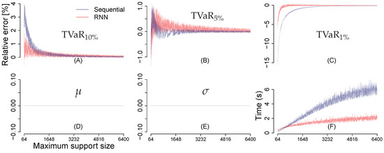 Further, we investigated reproduction of the second order moments, 1,5,10%-TVaR and run times as a function of maximum grid size permitted during aggregation. These results are displayed in Figure 7. Oscillation of error curves (Figure 7A–E) is caused by variability in the total risk support size attributed to the maximum permitted grid size and to the risk aggregation scheme used. As expected, estimates of the mean () and the standard deviation () perfectly reproduce their target values regardless of the support size. For small support sizes, the RNN model approximates TVaR better than sequential model (see Figure 7A–C). The pronounced underestimation of 1%-TVaR in Figure 7C is because 4-point regriding in Algorithm 5 eliminates negative probabilities at the expense of truncating min/max range of convolution and/or comonotonization support. The remedy is to increase the maximum support size. The sequential order has roughly linear growth of grid size because at the lth hierarchy of the sequential tree (see Figure 1), the left child node is always the aggregation of the first distributions, which guarantees the lth hierarchy has a grid size (before possible truncation) greater than that of the left child. The RNN order has nonlinear growth of grid size because for the lth aggregation, the two child nodes could be the aggregations of any number less than l of distributions, see Figure 4. In turn, grid sizes in the sequential run are larger on average than those in the RNN run. The latter yields higher speed shown in Figure 7F.