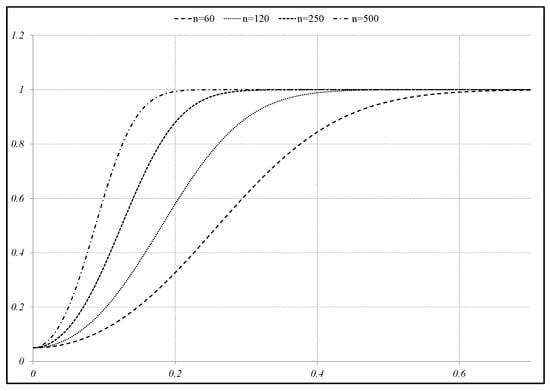 where the third line follows from the symmetry of the t-distribution (see, e.g., ), and the symbol denotes the cumulative distribution function of the noncentral t-distribution with degrees of freedom and noncentrality parameter . Moreover, it appears that the power function depends on only through . As a result, it allows assessing the power function as a function of only for a given value of n.