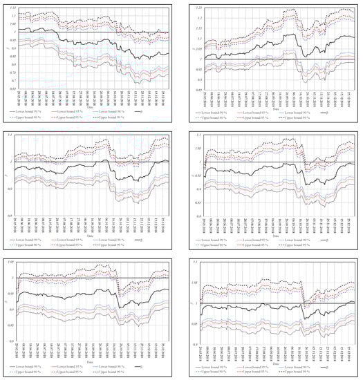 Finally, confidence intervals constructed for the beta coefficients of the considered equally-weighted portfolios cover one in almost all of the considered cases with the exception present during several weeks in October 2018–December 2018 for the , for the , and for the dimensional equally-weighted portfolio. At the end of 2018, the estimated beta coefficients increase, and only the confidence intervals constructed for the 5-dimensional portfolio do not include the value of one.