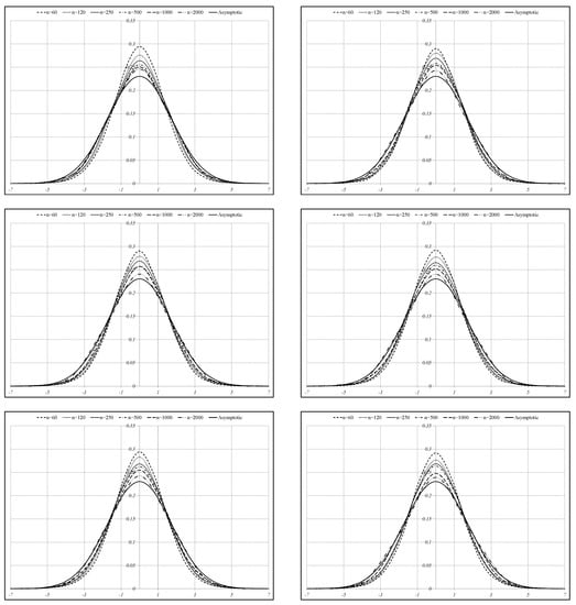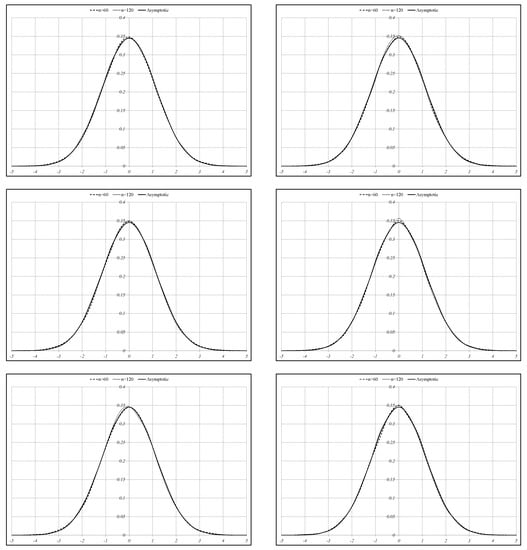 Kernel density estimators for and the asymptotic density of the standardized estimator for the beta coefficient in the case of the (top left), (top right), (middle left), (middle right), (bottom left), and (bottom right) dimensional equally-weighted portfolio. The asset returns are drawn from the multivariate t-distribution with 5 degrees of freedom.