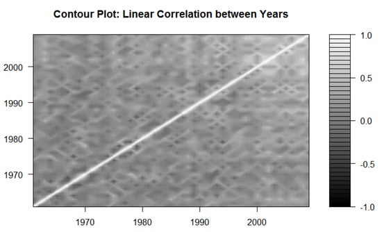 We explore the correlation structure between the stochastic mortality components over time and forward-age. Figure 1 suggests no particular dependence pattern over time; roughly 90% of the correlations have absolute value less than 0.35. That is, the collection of observations of the stochastic component from calendar year s appear uncorrelated with the collection from calendar year . This is evidence of independence over the time dimension.