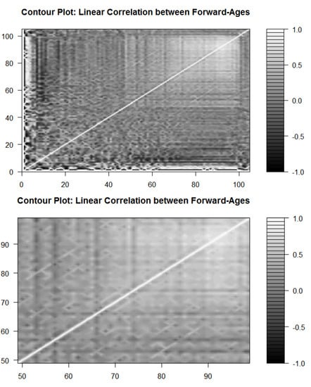 Figure 2 provides contour plots of correlation between the stochastic components over forward-age. In contrast to the contour plots over time, we do notice varying levels of correlation over forward-age, especially amongst the older ages. The correlation appears very volatile for the younger forward-ages. This is a technical consequence of having comparatively smaller sample sizes for forward-ages 0–48. Furthermore, correlation patterns are difficult to discern when centenarians are included. This is related to the high volatility of mortality data for centenarians. Consequently, we provide the contour plot for ages 49–99 in the second panel of Figure 2. Lighter shades of gray indicate higher positive correlation; the plot provides clear evidence that correlation increases with forward-age.