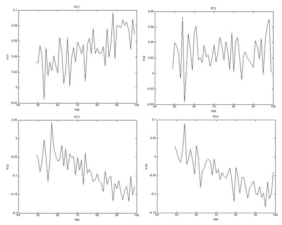 Figure 3 shows the top four principal components. They represent key movement in the random component by forward-age. We observe that some factors affect the stochastic components irrespective of forward-age, while others affect stochastic components from younger and older forward-ages quite differently. For example, the first principal component, which explains approximately 28% of the variation, exhibits a clear upward trend. This indicates that stochastic components from older forward-ages are more influenced than those from lower forward-ages. This confirms the result from Figure 2 that correlation increases by forward-age. Although the third and fourth principal components exhibit a downward trend, they are of less significance since they collectively account for less than 25% of the variance.