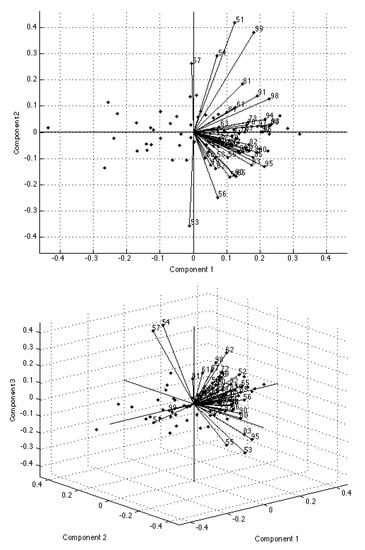Finally, the biplots in Figure 4 show the magnitude and sign of each variable’s contribution to the first two (upper panel) or three (lower panel) principal components, and how each observation is represented in terms of those components. The axes in the plot represent the principal components, the coefficients of the variables (forward-ages) on the principal components are represented as vectors, and the points are the scores of the observations (years) on the principal components.