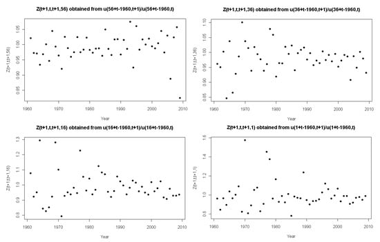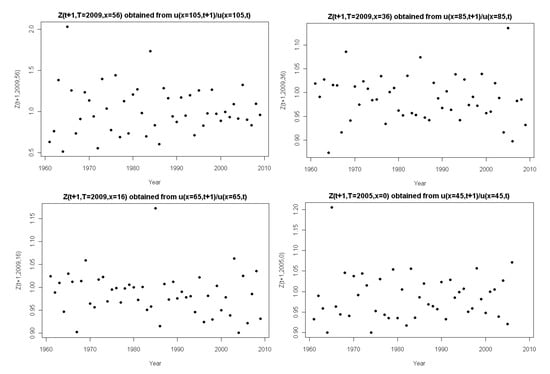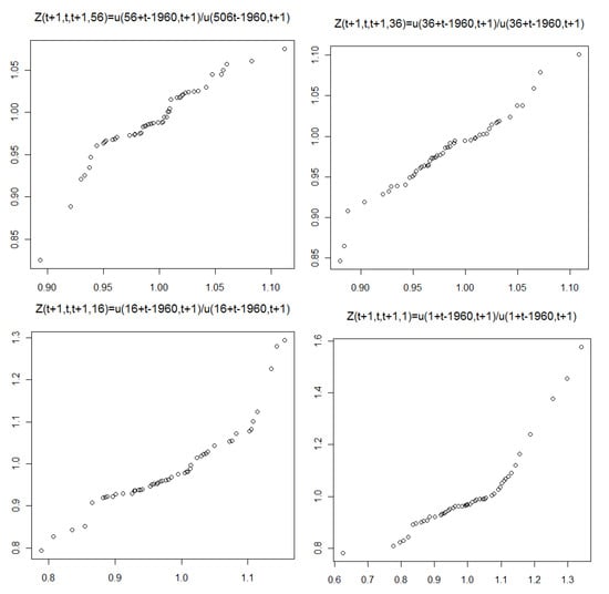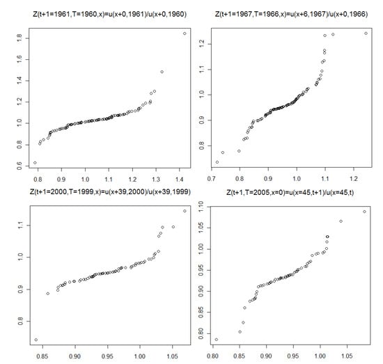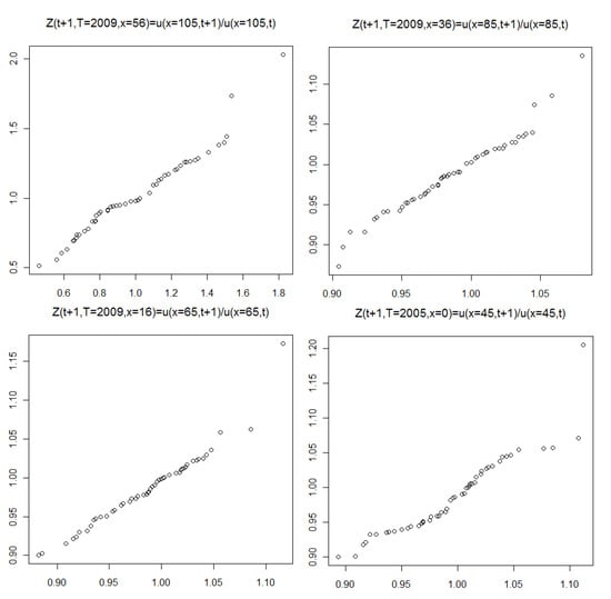 Figure 5 shows the observations of Z over time t for various fixed combinations of T and x. Over time t, the Z resembles a random sample. However, the underlying distribution changes with respect to the forward-age, , of the mortality components. The scale of the first plot is roughly five times larger than the others. This implies that the first plot demonstrates very high volatility, which is not surprising given that this plot represents a forward-age of 105.