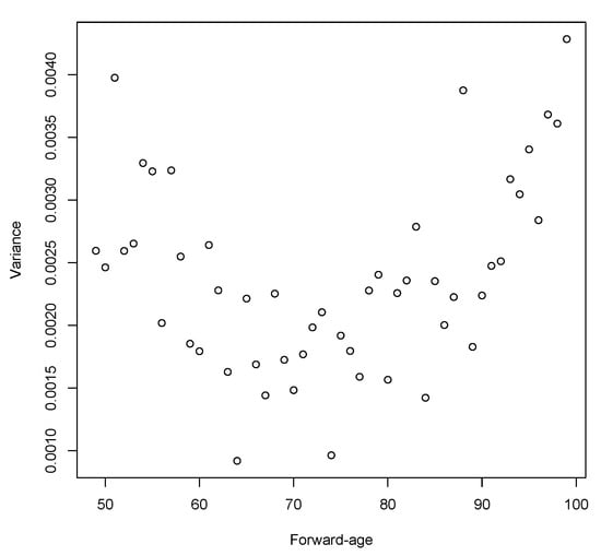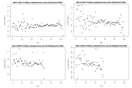 Figure 6 shows the observations of Z over age x for various fixed t. Recall that we have no observations of Z for ; for , we obtain a similar plot as that of , where the only difference is a shift in the x-axis, representative of a translation of the forward-age. We present the plots for as they are most informative. Figure 6 reinforces what is observed in Figure 5. The volatility of the stochastic component clearly varies with age. The forward-ages 0–40 and 90 plus generally exhibiting high volatility, with the remaining forward-ages, 40–90, exhibiting comparatively lower volatility.
