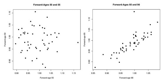 Two scatter-plots shown in Figure 11 highlight the different levels of dependence between observations from younger versus older forward-ages. We investigated the scatter-plots originating from observations of all possible pairs of forward-ages and found no evidence of non-standard types of dependence. Therefore, we consider the Gaussian copula. In order to allow for the presence of tail-dependence, we also consider the Student’s t copula. We note that other copulas, including those generating asymmetric tail dependence, would be interesting to consider; we leave this for future research.