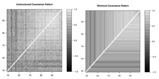 To proceed further, a multivariate distribution must be specified for the Z. We do so using copulas. Copulas provide the means to effectively study any form of dependence; see, e.g., (), (), and (). We focus on the use of the elliptical family. Previous work modelling dependence using the elliptical family include (), (), and (). Figure 2 suggests that the correlation between any pair of stochastic components depends on the smallest of the two associated forward-ages. This produces the “L” shapes intersecting the diagonal of the plot; see Figure 2 above. To accommodate this form of dependence, we introduce the minimum covariance pattern.