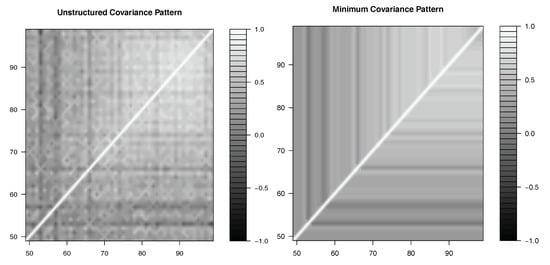 The minimum covariance pattern makes the assumption that the correlation between any pair of responses is determined solely by the minimum value of the corresponding covariate; in this case, forward-age. That is, . Note that this results in correlation parameters: