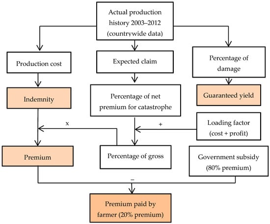 To minimize the adverse impacts of risks on smallholder farmers, the Indonesian government has implemented agricultural insurance for rice production since 2015. As a type of agricultural insurance, the government selected agricultural production cost insurance, of which the indemnity is equal to the cost of production (), while other countries adopted other types, such as named-peril crop insurance and yield-based multiperil crop insurance (). This is because the objective of agricultural insurance in Indonesia is to guarantee that farmers can sustain production. If production falls below a certain guaranteed yield, farmers with the agricultural insurance will get indemnity as an initial investment capital which is equal to production cost ().