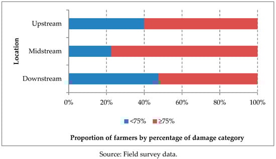 Average percentage of damage in the study area was around 73.9 percent. As shown in Figure 3, the majority (152 farmers, 63.3 percent) of 240 farmers had experienced a higher percentage of damage (percentage of damage 75 percent) than the guaranteed yield of the agricultural production cost insurance (percentage of damage = 75 percent). From the viewpoint of location, the proportion of farmers who had experienced a percentage of damage above 75 percent was higher in the midstream area than those in the downstream and upstream areas. Although the majority (63.3 percent) of farmers in the study area had experienced a higher percentage of damage (percentage of damage 75 percent), its average was lower than the guaranteed yield of agricultural production cost insurance (percentage of damage = 75 percent).