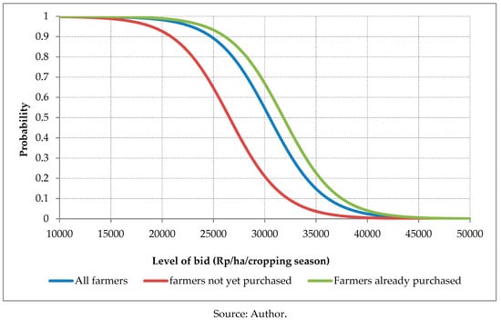 As shown in Table 7 and Figure 5, the mean value of WTP for farmers was Rp 30,358/ha/cropping season ($2.25/ha/cropping season), being lower by 16 percent than the current premium of Rp 36,000/ha/cropping season ($2.67/ha/cropping season). Using a similar equation, the mean value of WTP was estimated at Rp 26,369/ha/cropping season ($1.95/ha/cropping season) for farmers who had not yet purchased agricultural production cost insurance but at Rp 31,853/ha/cropping season ($2.36/ha/cropping season) for farmers who had already purchased the insurance, which were lower by 27 percent and 11.5 percent than the current premium, respectively.
