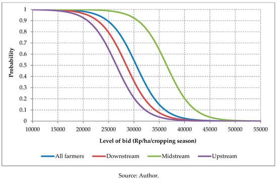 Moreover, as shown in Table 8 and Figure 6, there were differences in the mean value of WTP of farmers among the downstream, midstream, and upstream areas. The mean value of WTP of farmers in the midstream area (Rp 36,318/ha/cropping season, $2.69/ha/cropping season) was higher than that in the downstream area (Rp 28,794/ha/cropping season, $2.13/ha/cropping season) and that in the upstream area (Rp 26,267/ha/cropping season, $1.94/ha/cropping season).