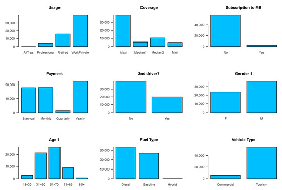 Subscription to mileage-based (MB) policy refers to a new scheme in which one of the main risk factors is the travel distance and policyholders are charged based on their mileage, also known as PAYD scheme. Policy Usage includes WorkPrivate, Retired, Professional and AllTrips. If a policy covers two drivers, age and gender are provided for both drivers. Different features of the car including age, engine power (represented by Din), fuel type, max speed (provided by manufacturing company), type—Tourism and Commercial, value and weight are provided and will be used as rating factors. In this study, we only consider the number of claims as a dependent variable.