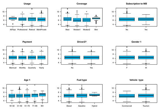 Table 3 presents the distribution of the number of claims across different categories. For the variable policy usage, although professional usage forms a small portion of our portfolio, claims under professional group is more than private and retired groups. However, from Figure 3 professional and retired groups have almost the same median loss and except for all trips we can see little difference among policies in this group. Under this insurance, the most comprehensive protection is provided by maxis and as can be expected this may lead to moral hazard. We can see there are more claims under maxis than under other types of coverage. The order of coverage is maxis, median 2, median 1 and mini and unsurprisingly, the percentage of claims reduces in the same order. Under mini, of the policies have made zero claims. Perhaps lower coverage is a motivation for policyholders to take more precautious measures. Figure 3 shows the effect of policy coverage on the amounts of claims and as we can see this will be an effective covariate in our model. From Table 3 those policyholders who were willing to subscribe to MB plan are less likely to have an accident. Figure 3 shows that the subscribers are less dispersed than those who have not subscribed. From the regulatory point of view, gender cannot be used as a discriminatory factor. In fact, we can see there is no considerable difference between male’s and female’s number of claims. In Figure 2 the least favourable payment frequency is quarterly payment, but we do not see considerable differences in claim numbers and amounts for different categories of payments. A large number of policies provide coverage only for one driver, but policies with two drivers have a slightly greater chance of making claims. The age of the first driver ranges from 19 to 103. We classify the policyholders in different age groups as 18–30, 31–50, 51–70, 71–85 and 85+. Most of the policyholders are in the range 51–70 and the next largest group is between 31 and 50. Both Table 3 and Figure 3 do not show a significant difference in claims frequency and claim amounts for different age categories and it seems that some categories can be combined together. In fact, in the next section we see that instead of these categories, we use age as a numerical covariate in our models as some categories are not statistically significant.