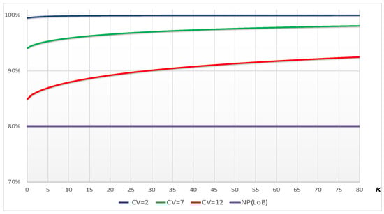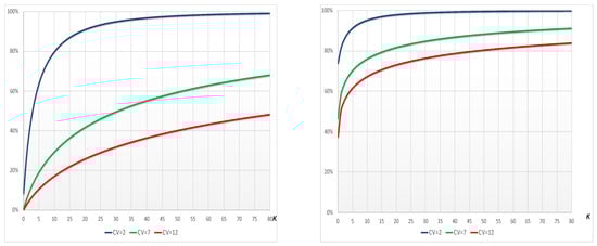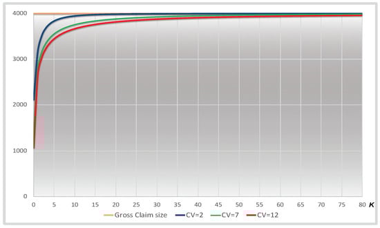 Equation (22) for different and retention limit (by the multiplicative factor k) is reported in the next Figure 3, where all ratios between net and gross CoV of the aggregate claims cost stay between 80% and 100%, decreasing as the CoV of single claims cost of the LoB grows.