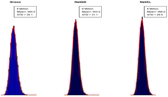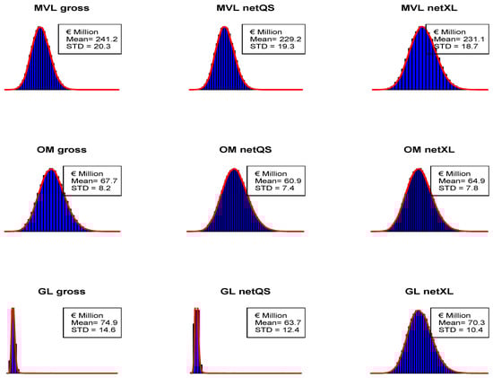 In particular, parameters calibration have been based on data from some specific sheets required by Italian insurers supervision (IVASS) and very similar to EIOPA’s Quantitative Reporting Templates related to claim processes. Standard deviation of systematic volatility () and the safety loading coefficient () are obtained by Italian market Loss Ratios and Combined Ratios. Regarding the latter, it depends by the average of empirical combined ratios observed during the previous 12 years; negative values of this coefficient represent LoBs where an average of combined ratios greater than 100% (e.g., in GL) is registered. The CoV of claim size is fixed, for each LoB, and calibrated on the basis of volatility of single claim size observed in empirical datasets of non-life insurance companies in the previous calendar years. Furthermore, a dynamic portfolio is assumed and then and , reported in Table below for the initial year for each LoB considered, will increase accordingly with annual rate of real growth g as to frequency and annual claim inflation rate i as to severity, assumed to be almost 2% and 3% respectively for all LoBs in the simulations.