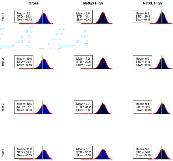 The quantiles of risk reserve are mitigated on both sides by the presence of reinsurance, more so with XL than with QS because of the reduction of the volatility. It is worth noticing that in the last two years the 0.50% quantiles are lower than 0 either for Gross and Net QS, while it is always positive over the planning period in the case of XL. On the other hand, the mean increases during the time horizon for all the distributions considered because of the positive technical results of the years.