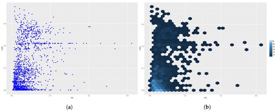 Plots of PD vs. LGD for mortgages in the “Very poor” (FICO score below 579) class—on the left, a simple scatter plot; on the right, a hexagonal heatmap with counts. (a) scatter plot; (b) hexagonal heatmap.
