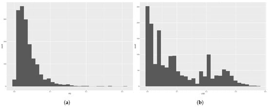 Histograms of the marginal distributions of PD and LGD in the “Very poor” rating class. (a) PD; (b) LGD.