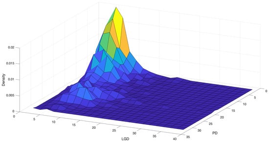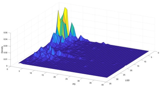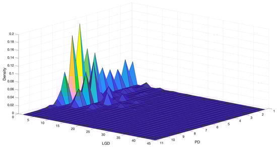 Always from Equation (6), we can verify that the sequence is exchangeable2. This comes directly from the exchangeability of , and and the fact that is a measurable function of . An implicit assumption of our model is therefore that the m counterparties in are exchangeable. As observed in McNeil et al. (2015), exchangeability is a common assumption in credit risk, for it is seen as a relaxation of the stronger hypothesis of independence (think about Bernoulli mixtures and the beta-binomial model). All in all, what we ask is that the order in which we observe our counterparties is irrelevant to study the joint distribution of their PDs and LGDs, which is therefore immune to changes in the order of appearance of each exposure. Exchangeability and the fact that and are conditionally independent given suggest that the methodology we are proposing falls under the larger umbrella of mixture models (Duffie and Singleton 2003; McNeil et al. 2015).