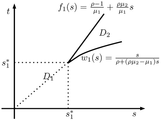 Note that, due to the form of the function given in (11), for any fixed s, there exists a unique minimizer of on which is either an inner point or (the one that is larger than s), or a boundary point s. Next, we check if any of is larger than s. Since , . So we check if . It can be shown that