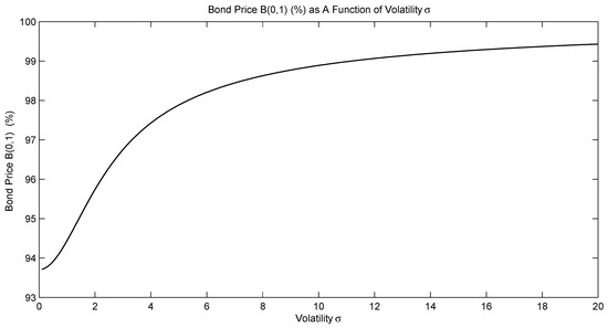 Using Equation (26), the calculations of bond prices by changing the values of coefficient are shown in Table 6 and Figure 2. Note that, for any time T, when , the unique positive root and , hence, .