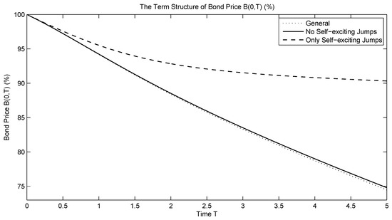 Table 9 shows that, if externally-exciting and self-exciting jumps arrive with an equal frequency on the long run and with the same distribution for their sizes, externally-exciting events matter more. We observe that the bond prices calculated based on Equations (26) and (27) are almost the same. Considering only self-exciting events, the bond price calculated based on Equation (28) is higher than its counterpart based on Equation (27). It indicates that their impact on interest rates is not as large as the impact of externally-exciting events. Of course, in practice, it is unlikely that the two kinds of events will arrive with the same frequency and the same distributions of jump sizes; this exercise was to study the impact of the nature of jumps.