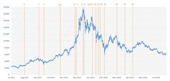 Bitstamp price (USD). Note: The figure shows the Bitstamp price series (USD) related to the sample period 1 July 2017–30 June 2018. Dotted lines indicate the dates at which the main events related to cryptocurrencies described in Table 1 occurred.