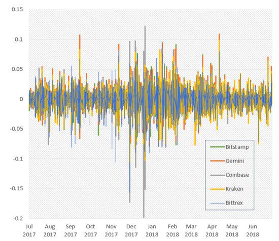 Exchange continuous returns. Note: The figure illustrates the analyzed Bitcoin exchange continuous returns during the sample period 1 July 2017–30 June 2018.