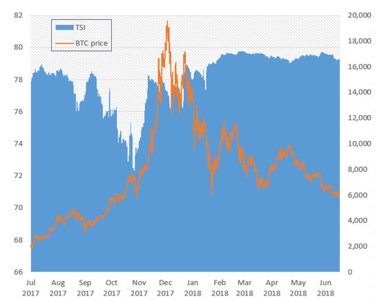 Similarly to the Bitcoin price, the TSI seem to show two main cycles: one in which the index witness a downward trend, as well as a following one where it steadily grows and finally smooths out. However, its dynamics are not synchronized with that of the Bitcoin price. This suggests that both in hype and correction periods interconnectedness may either lower or increase depending on specific market features.