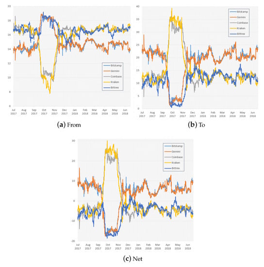 In general, we find that to some extent there is a kind of equilibrium with regards to the directional spillovers from and to others, as well as in the net ones. During most of the analyzed period, Bitcoin exchanges can be split into two groups: those who transmit return spillovers to others, namely Bitstamp and Gemini, and those who instead receive return spillovers, i.e., Bittrex, Coinbase, and Kraken. This can be immediately stated by a visual inspection of the net spillover indexes in Figure 4, which give us a hint on the leading and following Bitcoin exchanges during the analyzed time-frame. Moreover, we may add that the dynamics and magnitude of the directional return spillovers is quite similar within the same group.