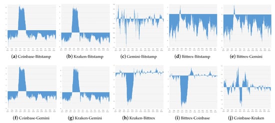Finally, we explored the net pairwise spillover indexes, which give us information on how return shocks are transmitted across Bitcoin market exchanges, from a pairwise viewpoint. We plotted the net pairwise spillover indexes in Figure 5.