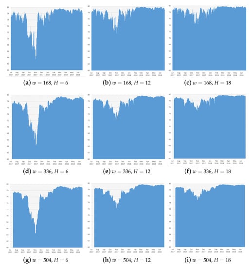 Robustness analysis. Note: The figure shows the TSI with estimation window widths w of 168, 336, and 504 h—corresponding to 1, 2, and 3 weeks, respectively—and predictive horizons H of 6, 12, and 18 h. Values are expressed in percentage terms.