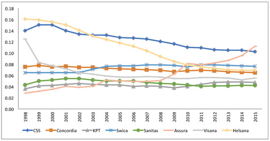 Groups of insurers often have more flexibility and are able to offer larger premium ranges for different members in the group. Additionally, a group of insurers can consolidate the business by restructuring the group. In 2015, more than of the insurers were either part of a group or related to a group by a collaboration contract, and these groups of insurers amount to of the market (Froidevaux and Kilchenmann 2016). As a result, the market share (in terms of number of insureds) of the insurers with more than 100,000 customers increased from in 1996 to in 2015 (see Figure 1). Figure 2 illustrates the development of market shares from 1998 to 2015 of the eight largest insurers as of 2015.